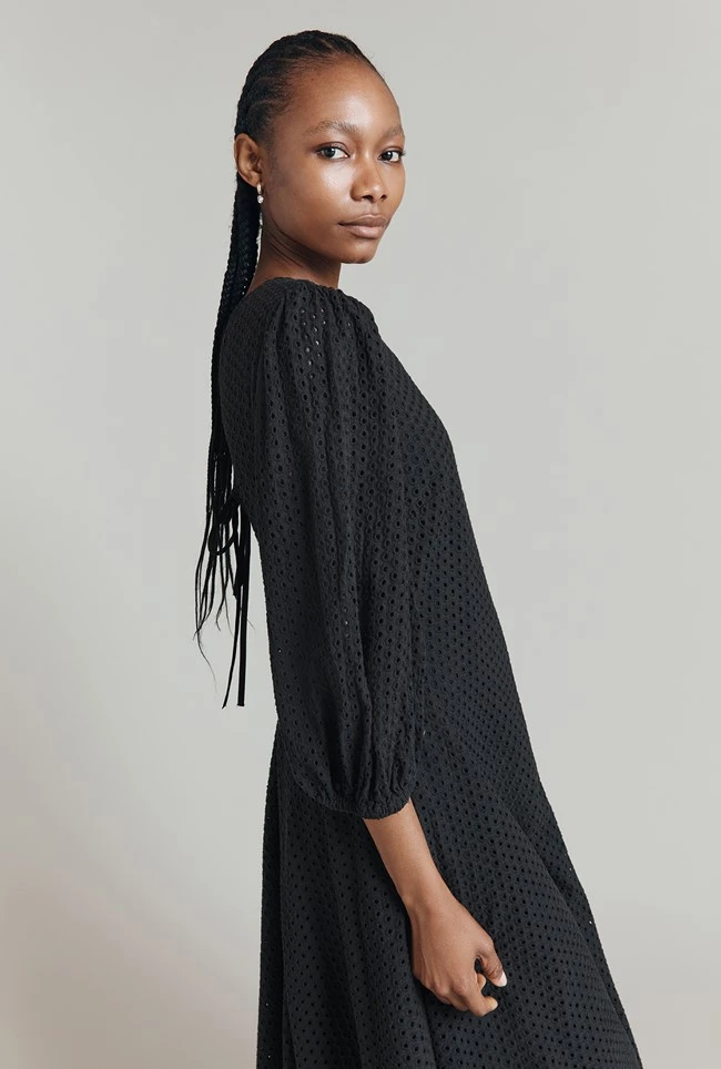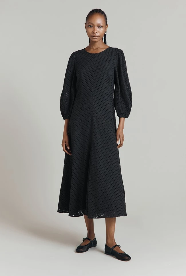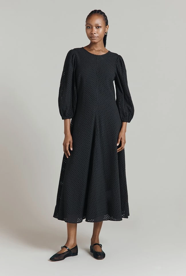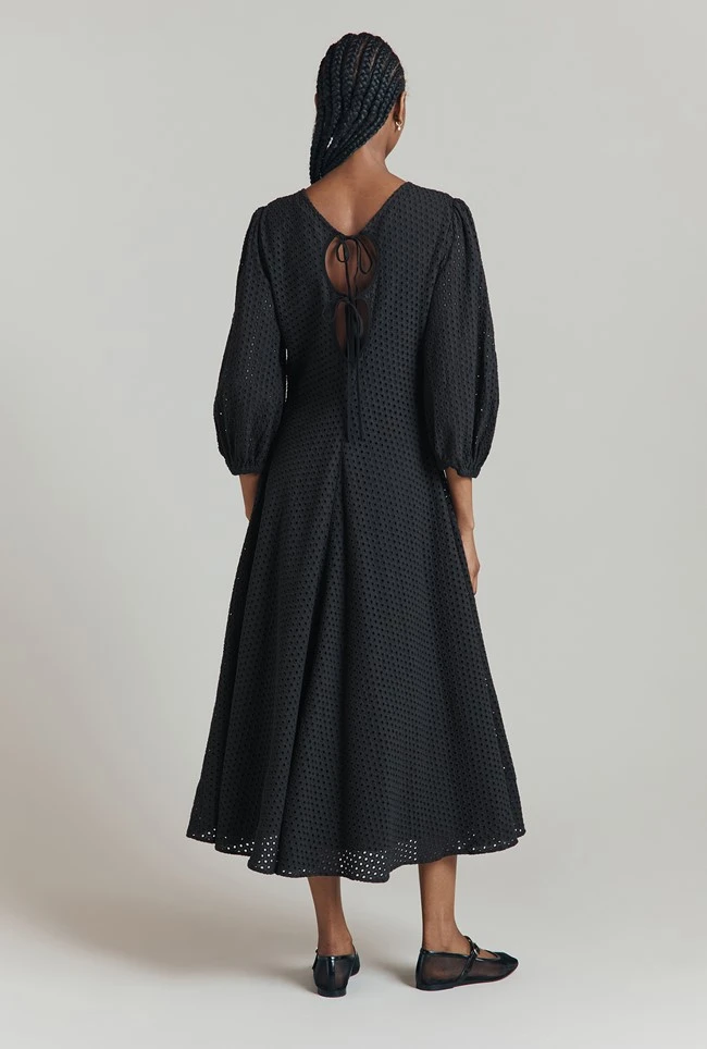 - We’re all about creating pieces with versatility that can see you through multiple occasions and settings. That’s why we know you’ll love Bella, a fit-and-flare midi dress in an elegant cutwork spot design. Semi-fitted with a round neck and voluminous ¾ sleeves, keyhole-and-tie detailing at the back. Wear with chic mesh flats for warm days at the office, switch out for heels for events, or pair with sandals for a chic holiday look. 100% cotton with cotton lining.