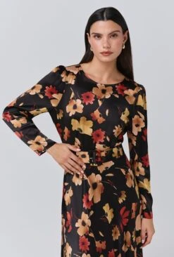 Belle is a midi-length dress with a flattering fit-and-flare silhouette. Crafted in garment-washed crepe georgette it features a rounded neckline with velvet tie bow detail and a bold mix-and-match print. A statement dress that will take you everywhere this autumn, from the office to special occasions.