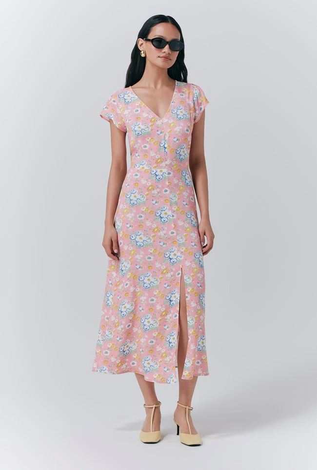 - Light, breezy, and made for sunshine – the Blair pink floral midi dress is your warm-weather essential. With its flattering v-neck, easy cap sleeves, and playful front slit, it’s perfect for everything from rooftop drinks to sun-drenched escapes. The keyhole back fastening adds a flirty touch, while the concealed side zip keeps the silhouette sleek. Cut to a midi length in a breathable fabric, Blair is effortless summer style at its best.