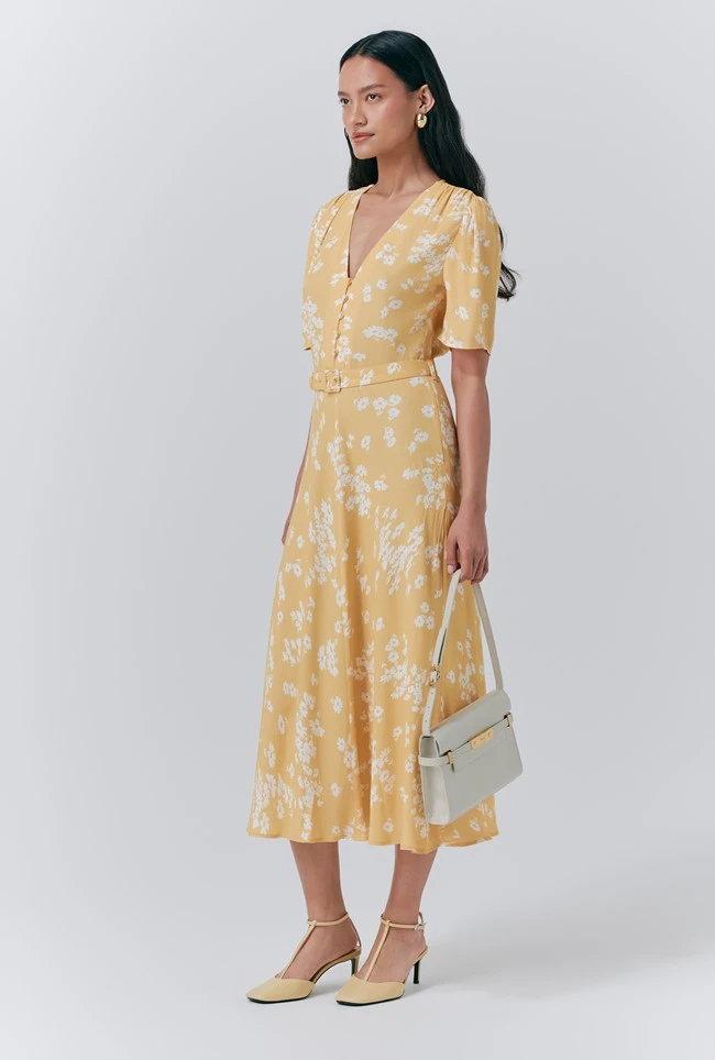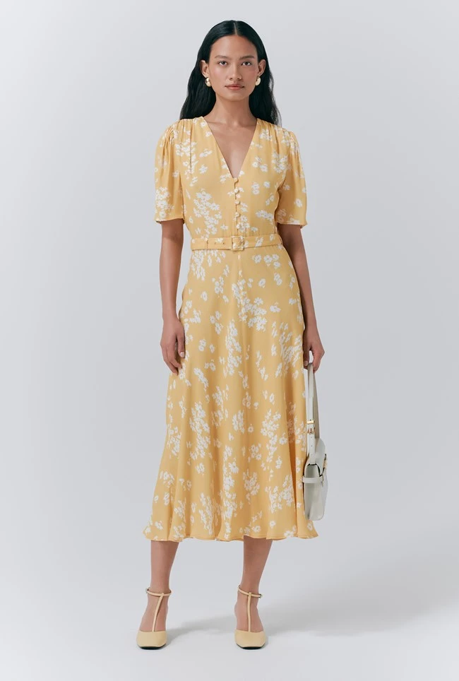 - Looking for the perfect floral dress? Look no further. Jemima is a yellow floral bias-cut midi dress rich in summertime charm. From the deep v-neck and covered value detailing at the front, to the gathered sleeves and self-covered belt, every detail has been carefully considered. Invisible side seam zip.
