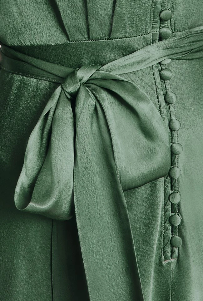 Designed in stunning satin, our knee-length Meryl dress in olive is a pretty button-through style that features pleats at the padded shoulders, seaming at the waist for a glamorous silhouette and a wrap tie to complete the elegant look. The bias-cut skirt makes for a flattering fit, while the front split adds a touch of femininity showcasing just the right amount of leg. Wear yours with stylish heels for a cocktail party or dinner date – plus it would also make the perfect bridesmaid’s dress.