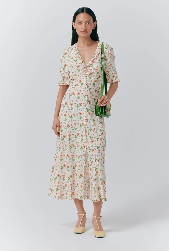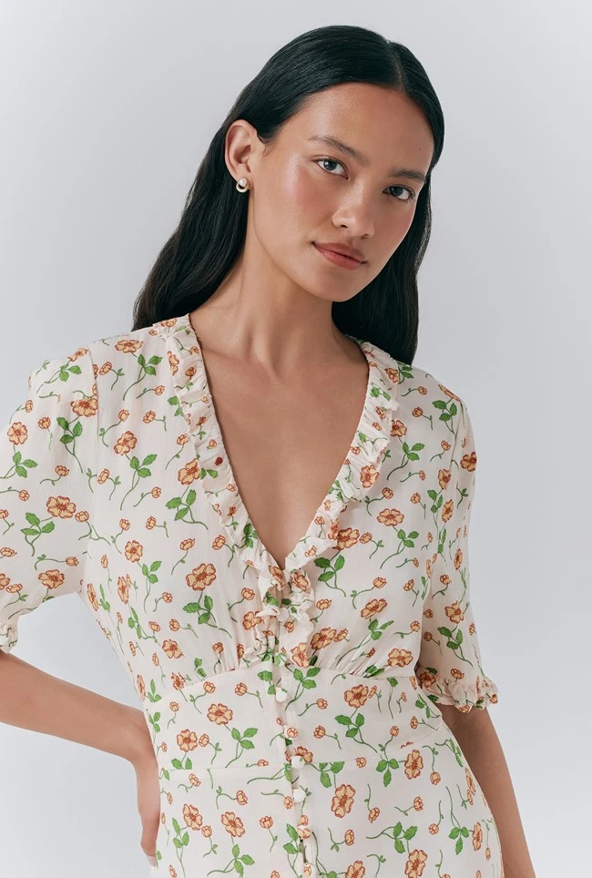 - Add a touch of whimsical charm to your wardrobe with the Saffie Dress. This floral midi tea dress features a delicate frill v-neck and flutter sleeves, crafted from a lightweight crepe fabric that moves effortlessly with you. The high waistline flatters your silhouette, while covered values run down the front for an elegant, vintage-inspired finish. Perfect for days when you want to feel both graceful and effortlessly chic.