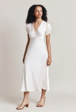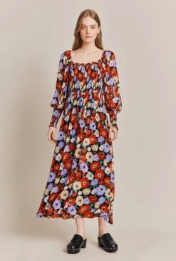 Una is a midi dress that’s as bold as it is beautiful. Cut from our signature crepe in a colour-pop vintage daisy print, it has a soft sweetheart neckline and three-quarter length sleeves that flow into shirred cuffs. Una is button-through to the waist, where a shirring panel provides feminine definition. Garment washed for a luxuriously soft feel. Wear with trainers or boots on rainy summer days or sandals when the sun’s out.